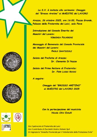Domenica 26 ottobre alle ore 16 in Sala Pieve del Palazzo di Fraternita si svolgerà la cerimonia di consegna del “Grosso Aretino” ai Maestri e Maestre del lavoro.